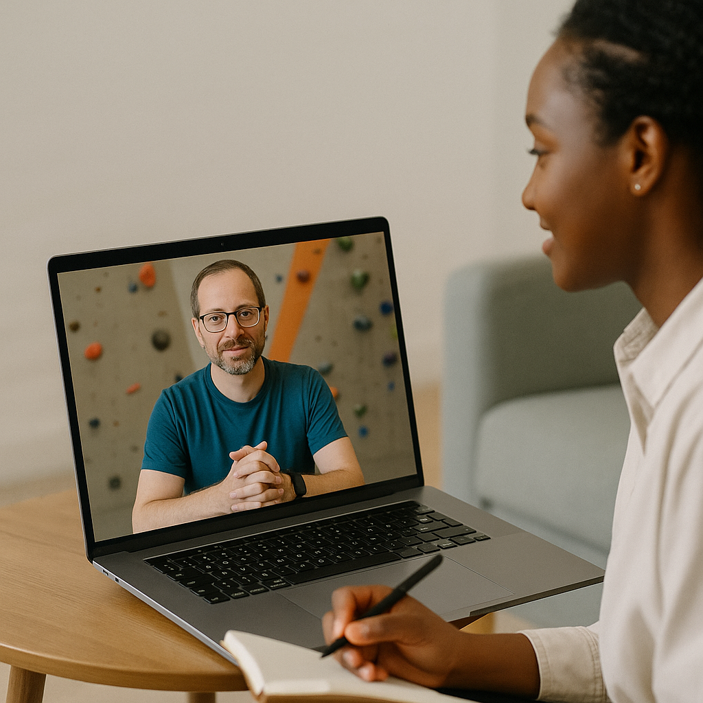 Individuelles Kletter- oder Physio-Coaching per Videotelefonie – 30-minütige Sessions, flexibel in Serie kombinierbar, für alle Erfahrungsstufen.